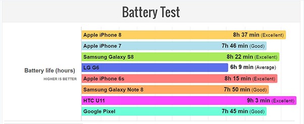 我们已经知道iPhone8的电池比iPhone 7还要小,那么这是否影响该机的续航呢?外媒PhoneArena对此进行了测试,结果是令人惊喜的。
