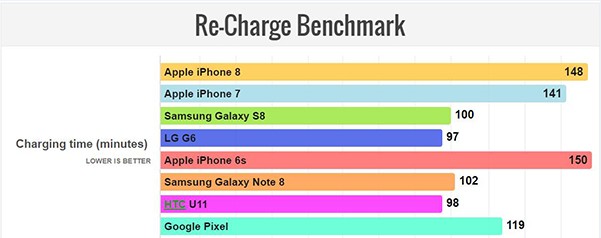 充电方面,iPhone 8支持快速充电,但包装中不包含快速充电器,外媒只能使用自带的不支持快充的充电器测试,结果表现并不理想,充电时间达到了148分钟,处于倒数水平,这个结果应该也是在大家意料之中的。