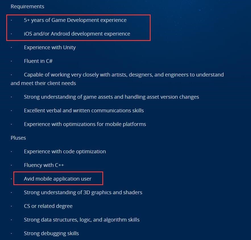 本次暴雪招聘的职位名为“高级客户端工程师”,从说明来看,暴雪希望招揽的人才是“一位经验丰富的移动客户端工程师,参与一项未公布的MMO RTS项目。”,该职位要求应聘者拥有5年以上游戏开发经验、iOS或安卓平台的开发经验、Unity开发经验、熟练运用C#以及移动平台的优化经验。而在加分项中也专门提到了“Avid移动应用用户”。