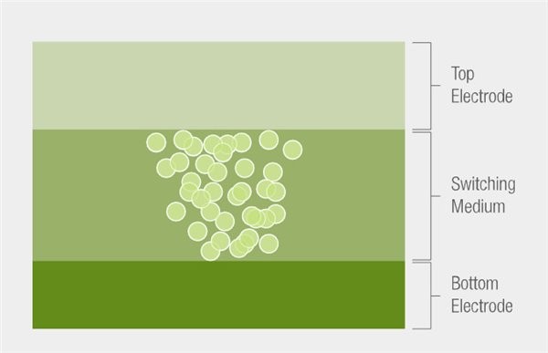 单一忆阻器其实就是一个长条形的器件,拥有三层结构,包含有上下电极和中间的开关层,通过电极施加不同的电压值就能改变中间的特殊结构的电阻值,从而达到存储数据的功能(电阻值代表0/1或者是更多位数据)。其稳定性非常好,具备了普通闪存颗粒不具备的超宽温度耐受值,-40-125℃。一百万次读写周期后,在85℃下数据可以保持10年不消失。