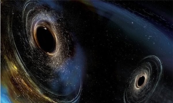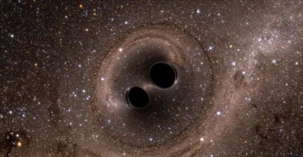 远在18亿光年外的宇宙一隅,两个黑洞:一个质量相当于31个太阳,另一个是太阳的25倍,融合在了一起,它们新生成了一个53倍于太阳的巨大黑洞,以及融合所发出的引力波。