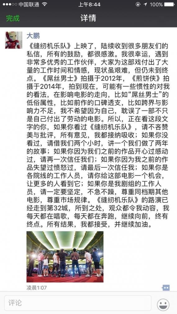 10月2日凌晨,大鹏在朋友圈发布一段文字,坦承电影《缝纫机乐队》目前“现状艰难”,这很大程度上是由于上一部作品《煎饼侠》导致了自己的口碑透支。他恳请有成见的观众能再给自己“最后一次机会”,因为电影幕后是上千位工作人员的共同努力,不希望因为观众对自己的惯性看法,耽误所有人的付出和努力。