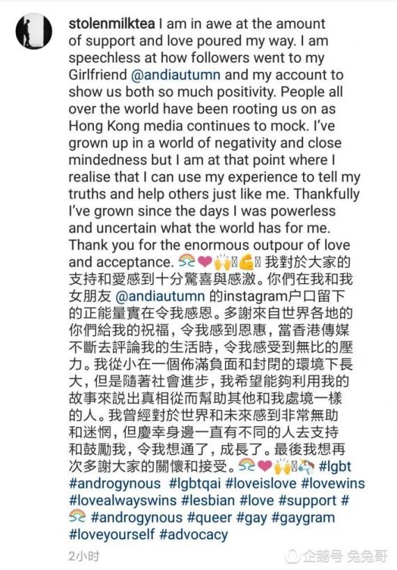 日前,小龙女吴卓林出柜的消息在网上引起了网友们的热议,包括吴卓林的妈妈吴绮莉在内,许多人都对此事说出了自己的看法。10月7日,小龙女吴卓林与女友两人再次在网上发文,表达了对支持自己的网友的感恩和感谢。同时吴卓林还直言:希望能用自己的故事帮助到其他人。