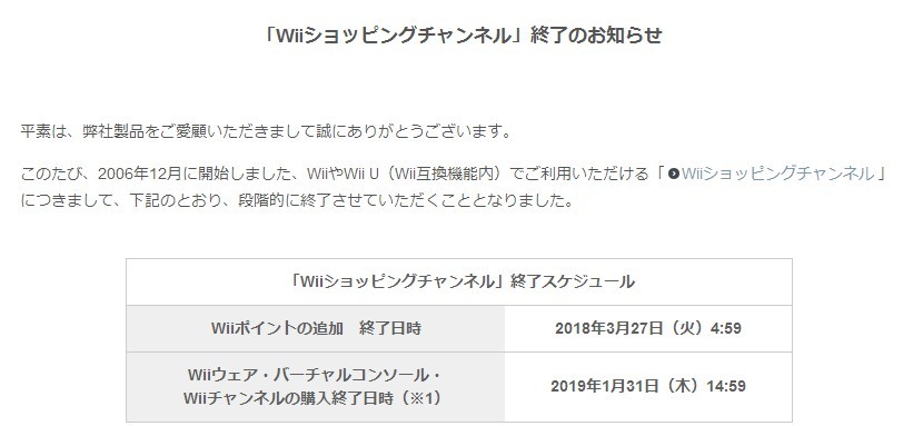 从2006年12月开始运营的Wii商店即将迈入历史,从2018年开始进入阶段性关停,2018年3月27日4点59分起Wii点数追加将停止,正式关停日期要等到2019年1月31日14点59分,届时在Wiiware、VC、Wii channel的购买都将关闭。