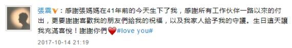 10月4日晚上9点,张震在微博上发表了自己41岁的生日感言:“感谢张妈妈在41年前的今天生下了我,感谢所有工作伙伴一路以来的付出,更要谢谢喜欢我的朋友们给我的祝福,以及我家人给予我的守护。生日这天让我充满喜悦!谢谢你们!”他还细心地加上了tag #love you#,还是一如既往的感恩平和的心态。