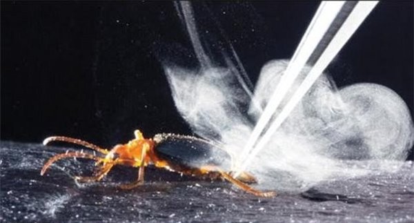 这种刺激性的酸性热雾由两种化合物组成,分别储存在放屁虫腹部的不同腺体中。在受到威胁时,这两种物质(对苯二酚和过氧化氢)会在一个空腔中混合,在酶的作用下发生剧烈反应,沸腾气化的混合物从腹部末端“噗”的一声喷出——这也是它们名称的由来。