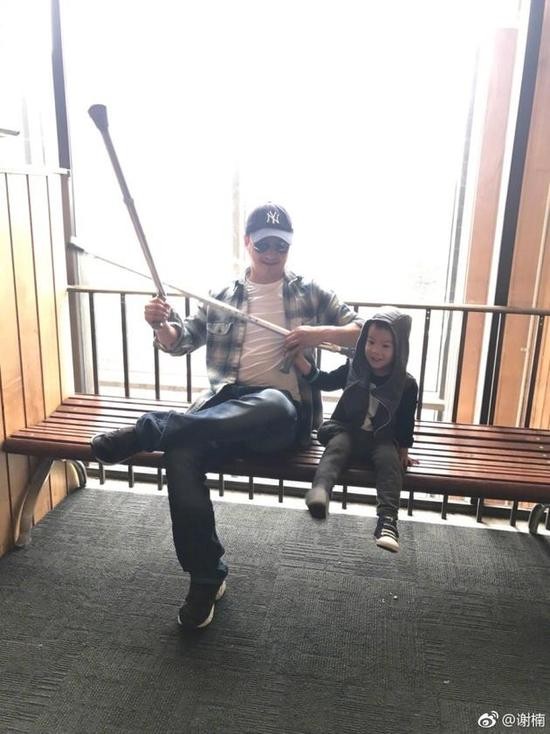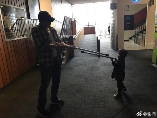 10月25日晚,谢楠通过微博晒吴京和儿子玩耍的照片,并称:“终于等到了爸爸,论拐杖的一百种用法。”照片中,吴京和儿子手拿拐杖当手枪,互相指着对方,另外一张,父子俩坐在长凳上,仍是拐杖当玩具,画面非常的温馨幸福,而吴京的大肚腩也成功抢镜。