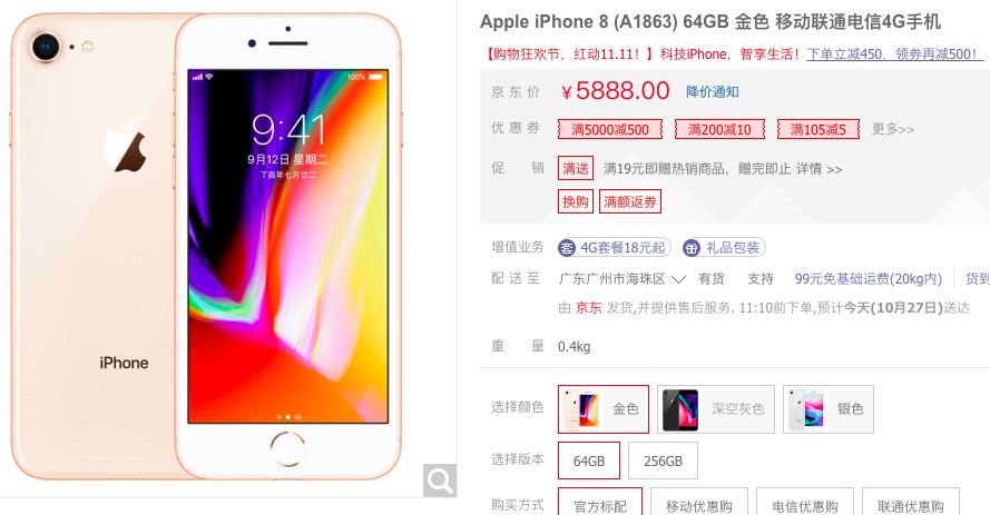 另外,京东商城上的iPhone 8虽然售价仍为5888元,但可以领取并使用500元的优惠券。