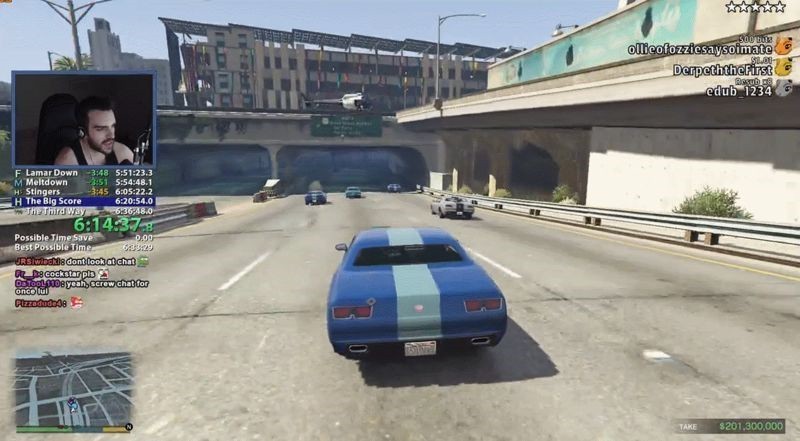 之前DarkViperAU以6:38:56完成过这项挑战,这个成绩可以说非常不错了,马上就能破纪录,并且他自己也感觉应该能在6:33:29内完成。不过,在《GTA5》这个开放世界里,发生什么事儿都不奇怪。当他开车第一次接近公路隧道时,从头顶飞过的警方直升飞机开火爆了他的后车轮。然后,游戏莫名地把他的车扔到左侧迎面而来的车上,让他没能够搭上右侧的卡车。那时他已经失去了太多的时间,不能巧妙地把自己的车开到那辆拖车上了。