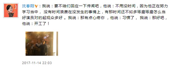 11月14日晚,小沈阳老婆沈春阳通过微博晒老公帅照,并曝夫妻两人对话,写道:“我说:要不咱们回应一下传闻吧,他说:不用没时间,因为他正在努力学习当中, 没有时间浪费在没发生的事情上,有那时间还不如多琢磨琢磨怎么当好演员对的起观众多好 。我说:那有点心疼你 ,他说:习惯了, 我说:那好吧, 他说:开工了! ”
