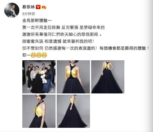 随后她发文回应表示相当遗憾,蔡依林发微博说:“金马新鲜体验~第一次不用走位排舞,反而紧张,是劳碌命来的。谢谢所有幕后同仁们昨天细心的陪我彩排。甜蜜蜜失误,相当遗憾,就来审判我的吧!但不管如何,仍然感谢每一次的表演邀约!每个机会都是难得的体验!耶~”