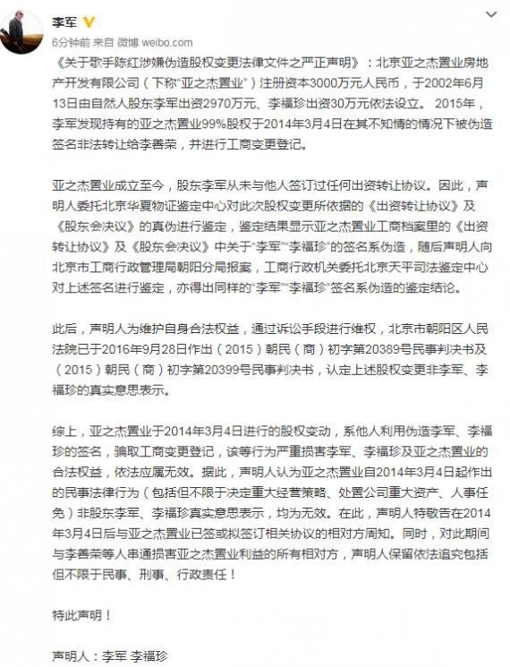 《关于歌手陈红涉嫌伪造股权变更法律文件之严正声明》:北京亚之杰置业房地产开发有限公司(下称“亚之杰置业”)注册资本3000万元人民币,于2002年6月13日由自然人股东李军出资2970万元、李福珍出资30万元依法设立。 2015年,李军发现持有的亚之杰置业99%股权于2014年3月4日在其不知情的情况下被伪造签名非法转让给李善荣,并进行工商变更登记。