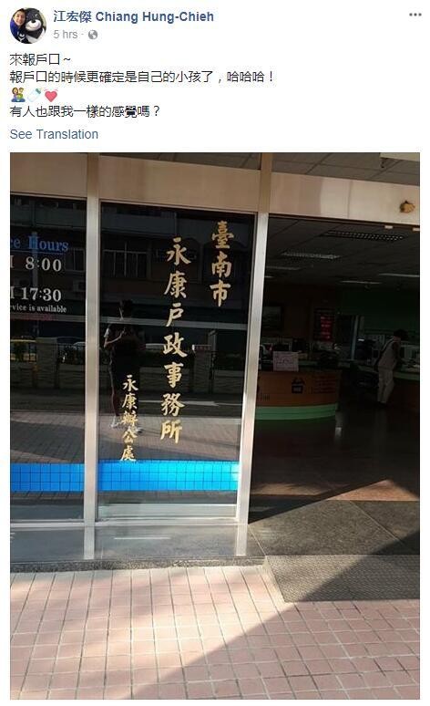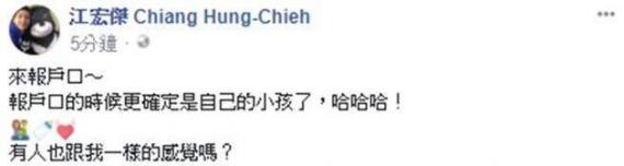 江宏杰稍早在脸书PO出照片,上头清楚可见是“台南市永康户政事务所”的门口,他也表示此行是为了替女儿“小小爱”报户口,虽然女儿已出生一个半月,也在脸书分享奶爸心得,并强调带小孩过程虽辛苦,但该有技能也已经慢慢上手,不过一直到来报户口时,才更确定“是自己的小孩”,接着更反问网友“有人跟我一样感觉吗”?
