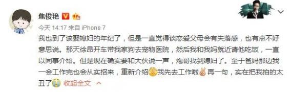 12月14日下午,焦俊艳公开恋情:我也到了该娶媳妇的年纪了,但是一直觉得谈恋爱父母会有失落感,也有点不好意思说。