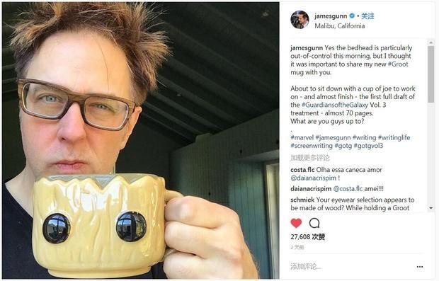 《银河护卫队2》电影日前也刚刚发布了蓝光/DVD版。詹姆斯·古恩则在Instagram上宣布,《银河护卫队3》70页的剧本初稿就快完成了,还晒出了萌萌的格鲁特咖啡杯。