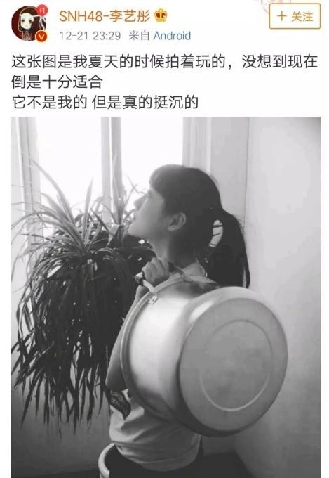 12月21日晚,SNH48冯薪朵、黄婷婷宣布辞去N队队长职务后,李艺彤深夜晒出自己的背锅照并配文称“它不是我的,但是真的挺沉的”随即秒删,疑似回应队长辞职一事。就此新浪娱乐向经纪公司询问,对方暂未回应此事。据悉23号是李艺彤的生日会,21号晚上公演现场,成员曾透露她会在生日会现场回应近日风波。