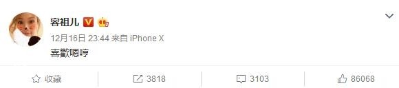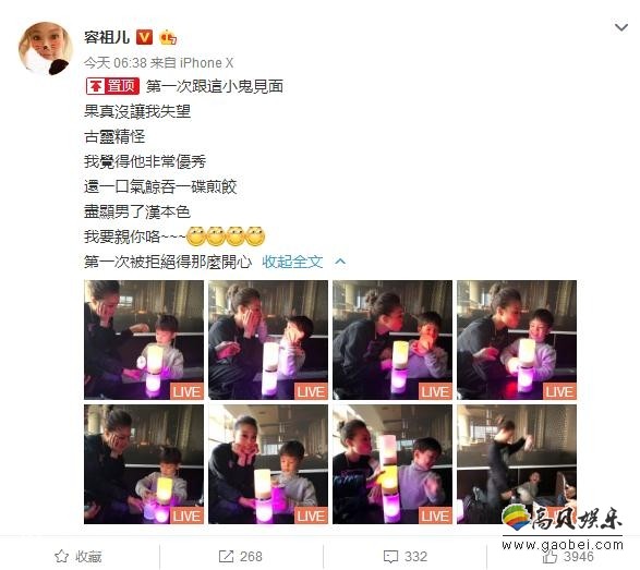 12月22日,容祖儿晒出与嗯哼的合照,并配文:“我要亲你咯~~~”,不过画面中的嗯哼却躲避容祖儿的亲吻,说好的亲吻狂魔呢!不过容祖儿对此表示“第一次别拒绝得那么开心”。这条微博被置顶,此前容祖儿就曾特别发微博告白嗯哼“喜欢嗯哼”,完完全全的迷妹啊。