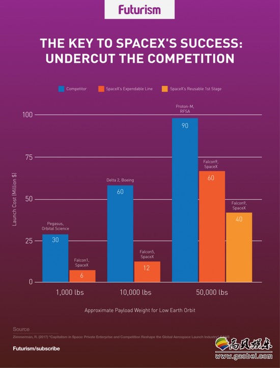 太空政策研究所创始人、乔治华盛顿大学艾略特国际事务学院的荣誉教授约翰·洛格斯登(John Logsdon)表示,每个公司可能都有稍微不同的目标,并有实现它的不同方式。但很明显,SpaceX正在颠覆蓬勃发展的私营太空产业。洛格斯登称:“与竞争对手相比,SpaceX公司已经能够提供将卫星送入轨道的低价标准服务,其可靠性也值得信赖。”