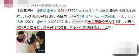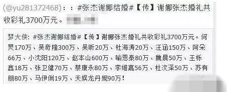 而后有人又发出了一条张杰谢娜结婚的彩礼名单并附有礼金明细的微博,上面显示吴奇隆300万、何老师170万、汪涵150万、小沈阳120万、蔡康永苏有朋都是80万,维嘉56万,不怎么有钱的的海涛和吴昕姐弟估计互相发短信商量了一下,要不咱们都随20万吧。