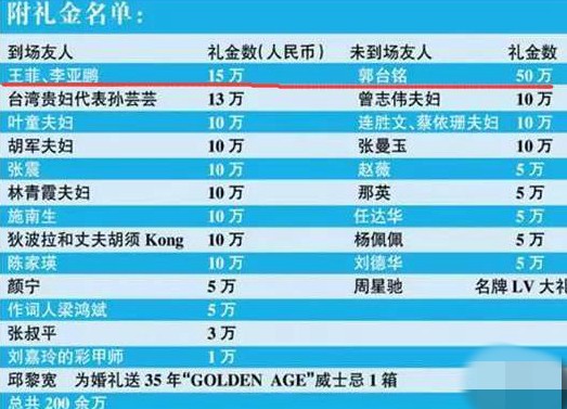 网上曾出现过一份彩礼名单,其中天后王菲和李亚鹏夫妇包了15万、胡军夫妇10万、那英赵薇都是5万,最多的是富商郭台铭50万,总共收到200多万的份子钱。大家可别嫌少,那时候可是2008年。