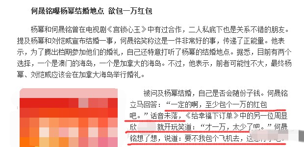 除此之外,2013年杨幂婚礼的时候,何晟铭就说过至少会给杨幂包一个一万块的红包,但是被同剧组的周显欣嫌弃太少了,难道明星们红包起步价至少万元打底?