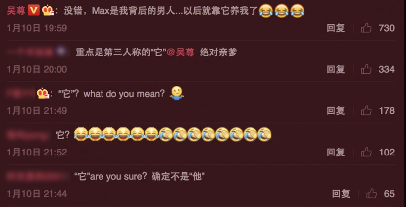 1月11日,吴尊晒出了一家四口同游巴黎的游客照,妻子出镜身材高挑,并称:“男人背后最伟大的两个女人。”意指妻子和女儿。有网友在评论里晒出吴尊儿子Max的照片,吴尊随即回复,“没错,Max是我背后的男人...以后就靠它养我了。”不料一时手滑,误将“他”打成了“它”,引发网友调侃,“哈哈哈,果然亲爹!”