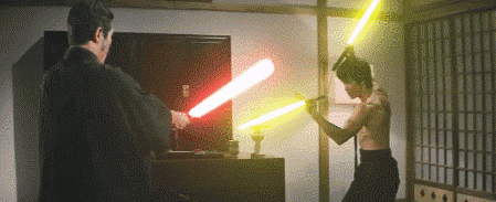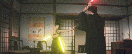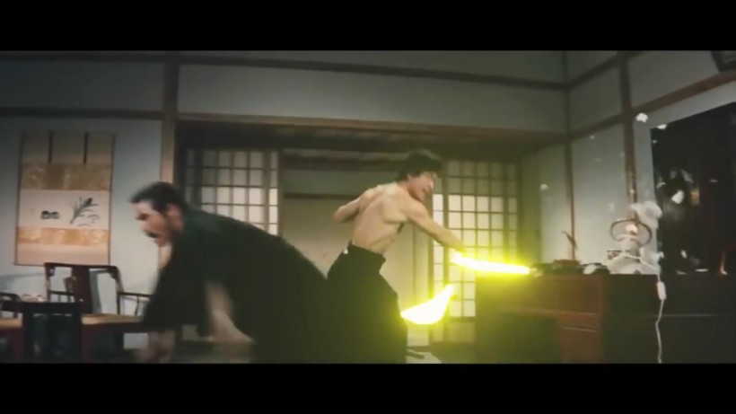作者为电影中李小龙和敌人的武器都加上了光剑特效,双节棍光剑和武士刀光剑运动的镜头自然流畅,完全看不出任何违和感。虽然平日里看习惯了李小龙挥舞双节棍,但加上光剑特效看着就让人为他捏一把汗,毕竟双节棍光剑如果使用时出现失误那绝对是致命的。