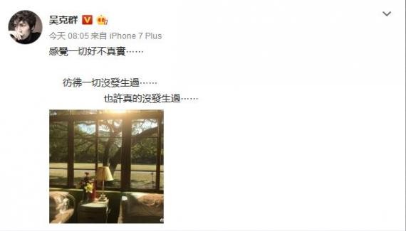 吴克群12日透过经纪公司证实,母亲凌晨在家中病逝,当时家人全都陪伴在侧,和妈妈度过最后的时光,时隔3天,他仍难以接受母亲离开的事实,发文难过的说,“感觉一切好不真实。。。。。。仿佛一切没发生过。。。。。。也许真的没发生过。。。。。。”同时PO出空房间的照片思念母亲。