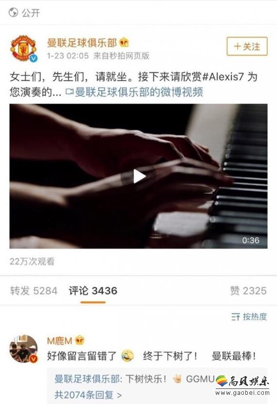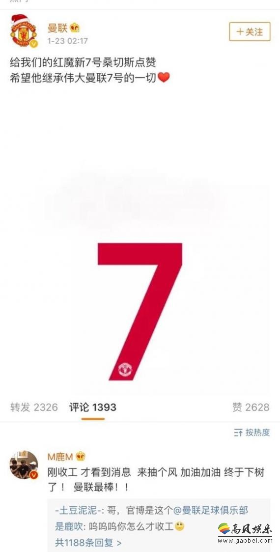 1月23日,著名曼联球迷鹿晗凌晨一收工,就去曼联留言庆祝:“刚收工,才看到消息,来抽个风。加油加油,终于下树了,曼联最棒!”结果经网友提醒,鹿晗发现那个不是官方号,急急忙忙又跑去官方号留言,还说自己留言留错了,又重复了一句:“曼联最棒!”迷弟的样子实在可爱。