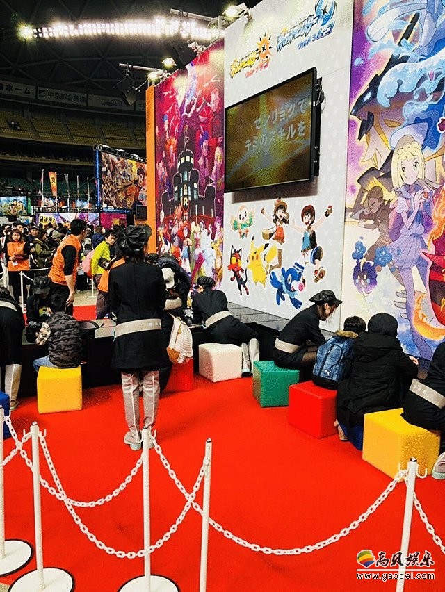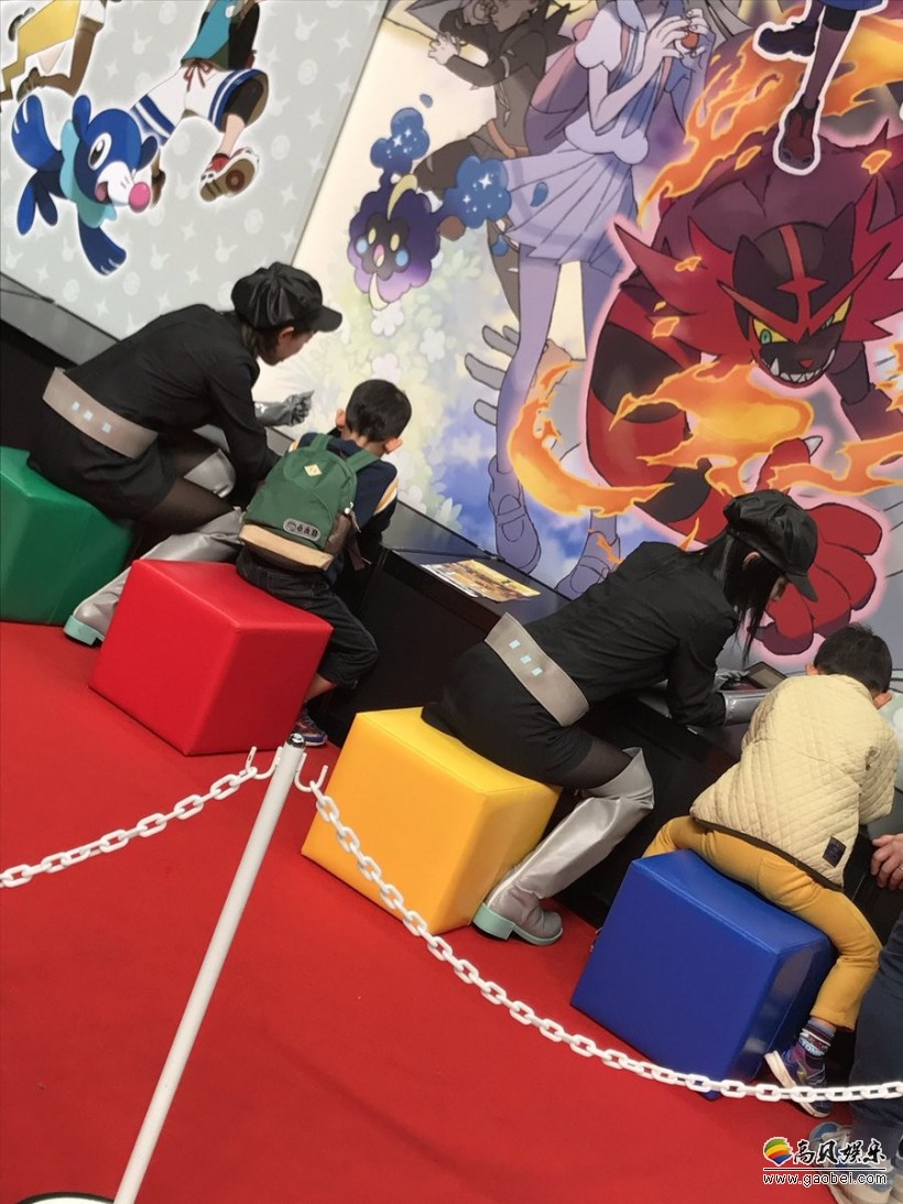 现场的女性工作人员穿着黑丝短裙长靴,装扮成了《精灵宝可梦:究极太阳/月亮》中火箭队里小姐姐的样子,有一点点小性感。