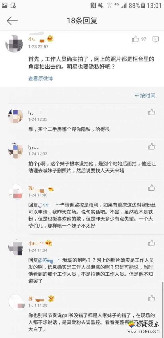 针对此事有粉丝发言表示,网上确实流出了Gai去房交所的照片,而且照片是从柜台角度拍的,所以工作人员确实存在偷拍嫌疑,明星也需要保护隐私。反对者则称Gai不仅骂人还人身威胁,不应被洗白。还有一名围观者认为,Gai错在没有控制好暴脾气,那名女生没有错,粉丝可以调监控来还原事件真相。