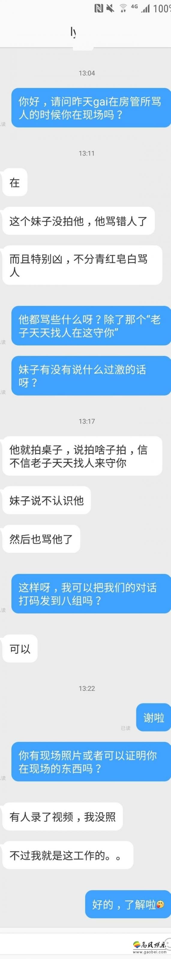 该帖子贴出了与房交所两名在场者的对话截图,第一名在场者自称就在那里工作,他表示,Gai“不分青红皂白骂人,而且特别凶”,“这个妹子没拍他,他骂错人了”,还描绘当时Gai拍桌子放话道“信不信老子天天找人来守你”;第二名在场者则表示粉丝没弄明白状况,房交所有很多部门,但事件过程一时说不清楚。