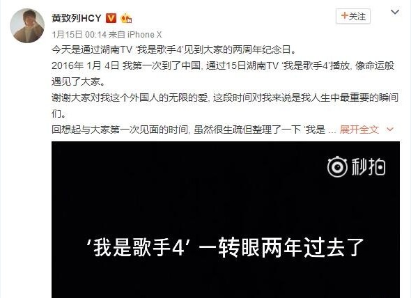 近日,歌手黄致列通过个人微博公开了一段视频,该视频是为了纪念参加《我是歌手》两周年而剪辑的,视频中是黄致列参加《我是歌手》中演唱的经典歌曲。转眼间时间过去两年了,大家对当时黄致列在《我是歌手》的表现还历历在目,他还在该条微博下面评论“怀念”引粉丝回忆。
