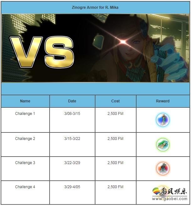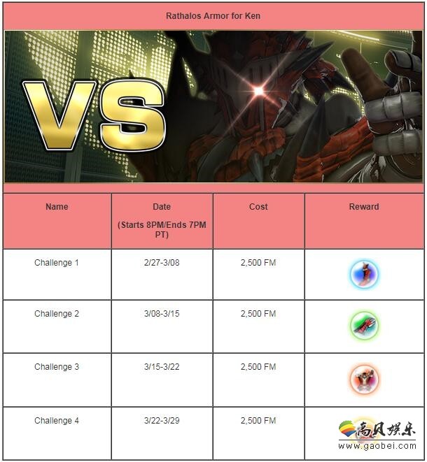 肯(雄火龙套装)挑战时间表: