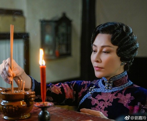 1月24日晚,刘嘉玲通过微博晒《半生缘》剧照,并为网友送上节日祝福,称:“腊八节吉祥!”照片中,刘嘉玲穿着绣花旗袍,一脸精致的妆容,皮肤白皙红润,表情严肃庄重,手拿香烛正在上香,看上去非常的端庄。
