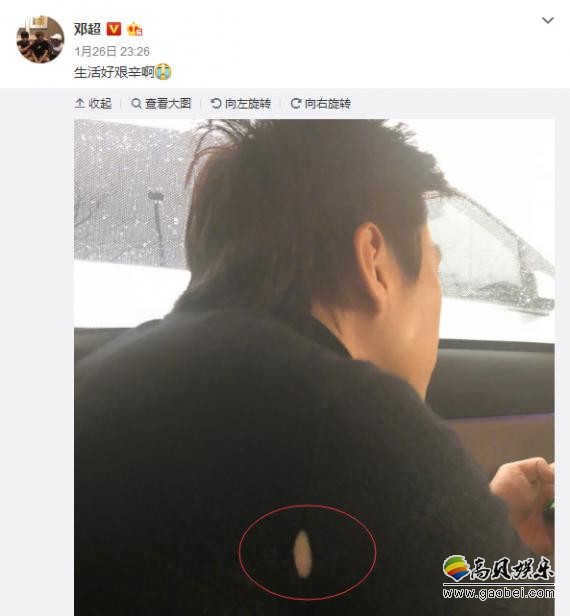 2018年1月26日深夜,邓超在微博发布一张照片,只见他身穿黑色毛衣坐在车里玩手机,应该是赶通告途中无聊玩游戏打发时间。照片的焦点是他的衣服后面有个不小的破洞,看样子是超哥胖了把衣服撑破,不过也有可能是实在穿太久给穿坏的(我怎么有点不太信呢!)。