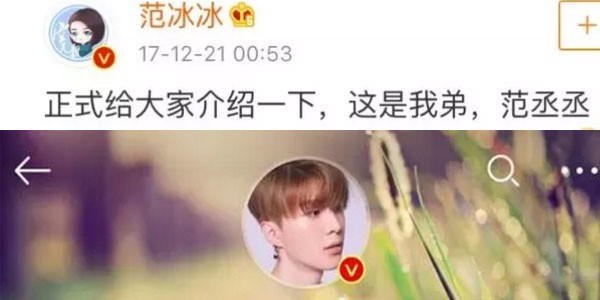 等到圣诞节前的时候,范冰冰就直接发弟弟帅照给大家“正式介绍一下”了,还麻烦大家要多多关照。随后姐夫李晨也第一时间转发,范丞丞分分钟登上热搜榜。等到范丞丞的节目正式开播进入宣传期,范冰冰直接把微博头像换成弟弟,姐夫李晨本来也想换,但因为在广告宣传期不能随意更换头像。可见姐姐范冰冰对弟弟的关心。
