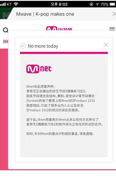 网上更是曝出韩国娱乐公司Mnet针对爱奇艺《偶像练习生》涉嫌抄袭其公司制作的节目《Produce101》发布声明。声明中指出,《偶像练习生》在节目理念和结构、赛制、视觉设计等节目模式(format)的各个要素和Mnet的《Produce101》高度相似,而Mnet从未以任何方式参与《偶像练习生》的制作或与之有任何形式的合作,并对遭遇侵权表示遗憾。