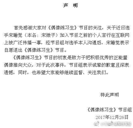宋睡觉在网络上的不正当言论影响极其恶劣,所以他在很早之前就退赛了。在接收到退赛声明之后宋睡觉本人也在微博发声疑似洗白自己。