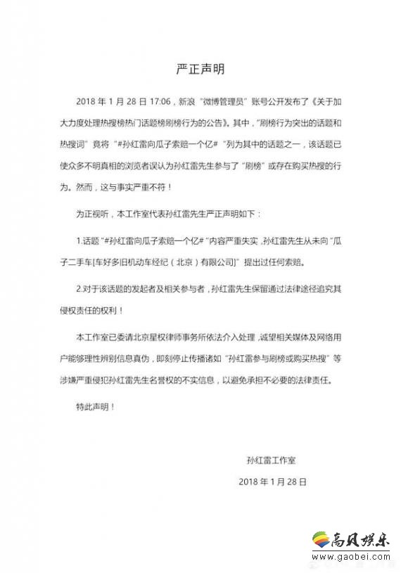 近日,微博热搜将进行全面整改引发热议。28日下午,“微博管理员”公布了一份存在刷榜行为的名单,并表示有一些企业及娱乐行业从业者为了获取关注和流量。在这份名单中,孙红雷的话题也赫然在列。对此,孙红雷工作室发表声明辟谣,表示话题“孙红雷向瓜子索赔一个亿”内容严重失实,孙红雷从未提出过任何索赔。第二,对于该话题的发布者和参与者,孙红雷保留追究的权利。