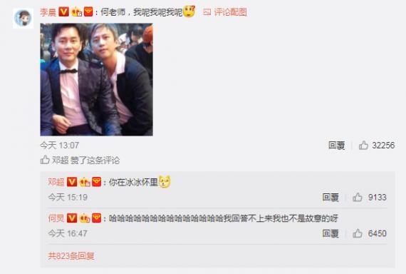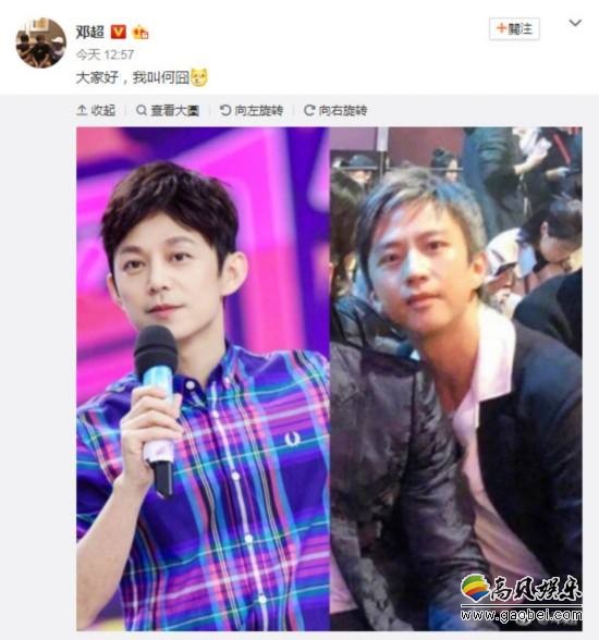 邓超在微博公开一张组图,左边是穿着格子衬衫的何炅,右边是自己,似乎因照片中的自己表情、模样撞脸对方,而发文写道:“大家好,我叫何囧。”没想到钓出李晨在底下回应,贴出被他裁掉的两人合照原图问:“何老师,我呢我呢我呢?”对此他则神回复“你在冰冰怀里”,而“正牌何老师”何炅也回说:“哈哈哈哈哈哈哈哈我回答不上来,我也不是故意的呀。”