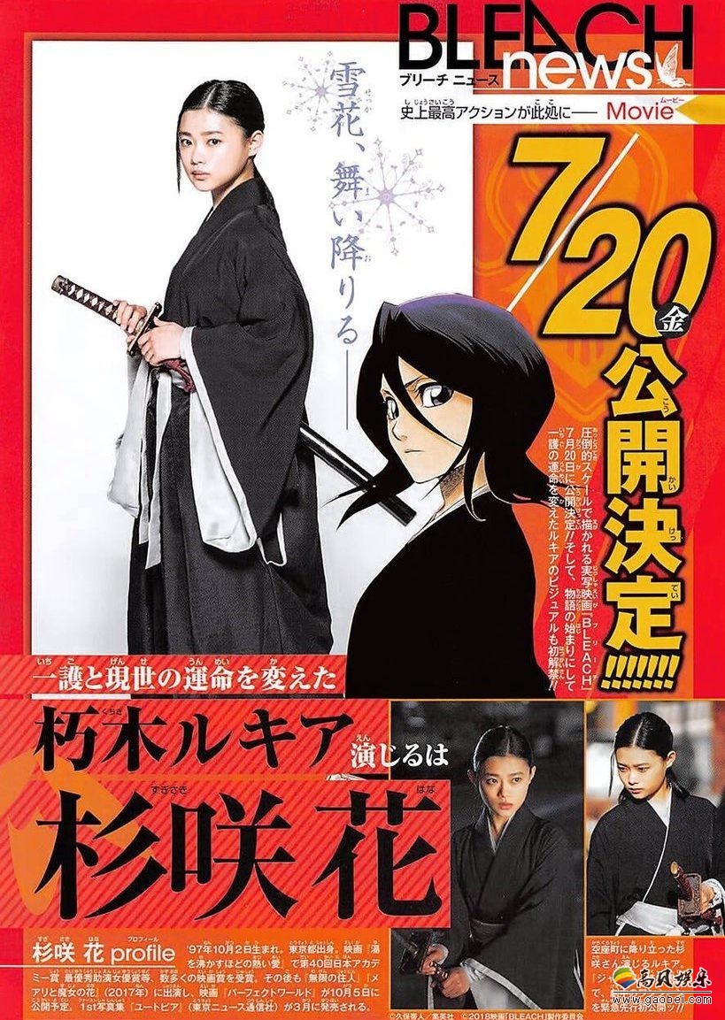 有关《死神》真人电影的消息,官方放出的一直比较少,从公开拍摄电影到现在只放出了男主角黑崎一护和朽木露琪亚的两张定妆照。官方宣布《死神》真人电影将于2018年7月20日上映,估计之后消息公开的速度就会加快了吧,现在真的很想知道井上织姬会由谁来出演。