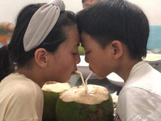 叶一茜晒出儿女的温馨瞬间,并称:“姐弟俩的感情甜过椰子水了,为娘甚感欣慰!”照片中,森碟扎着马尾,头上戴着发箍,和弟弟脑门碰脑门同吸椰子水,最开始姐弟俩都在默默的喝,后面慢慢变成互相有爱的看着对方,再后来姐弟俩就开始逗乐,使劲的抵对方脑门,画面温馨,十分有爱。