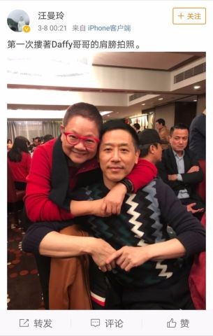 近日,汤臣国际娱乐有限公司总监汪曼玲晒出与唐鹤德的合影。