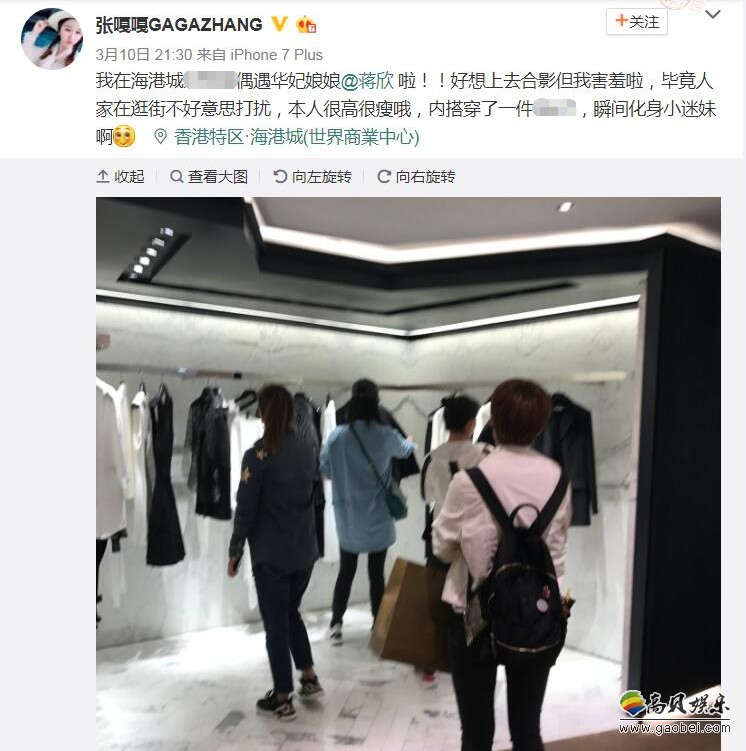 3月10日,有网友在香港海港城偶遇蒋欣,还配文惊叹她“本人很高很瘦哦”。从网友晒出的照片来看,蒋欣从“大码”瘦到了“中码”,毕竟17年8月蒋欣在剧组拍戏时,还被人拍到有若隐若现的小肚腩。蒋欣近期也频频在微博上晒出健身照,看来健身还是卓有成效的。
