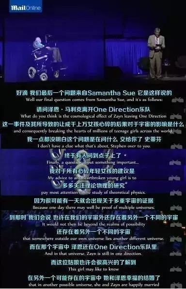 正当台上台下就学术问题讨论得如火如荼时,一个观众突然问道:“对于Zayn离开One Direction乐队这件事情的宇宙影响,以及事后世界上千万少女心都粉碎了的后果你怎么看?”