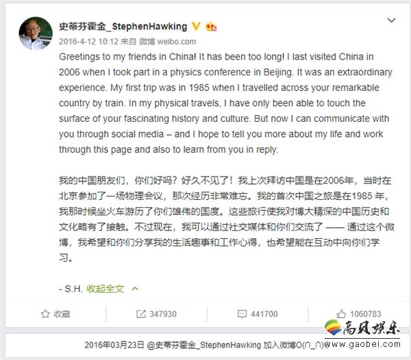 2016年3月份霍金开通了微博,他在4月12日第一条微博就讲述了他和中国的缘分。当时在他的第一条微博底下,拥有超过2000万粉丝的邓超和李开复等人也慕名前来和霍金打招呼。很快地,他的微博粉丝在第一条微博发出后的四个小时里迅速上涨到84万人。