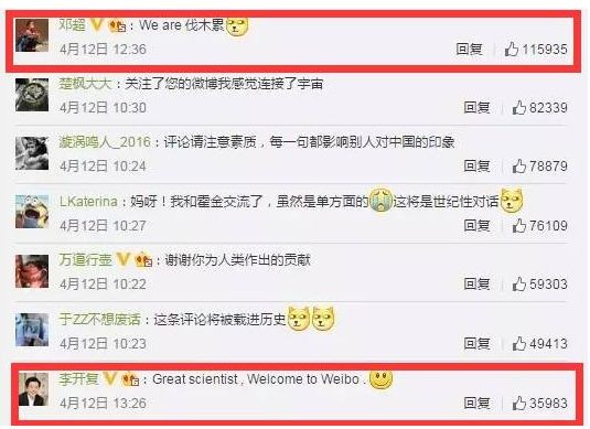 邓超和李开复在霍金的微博下打招呼