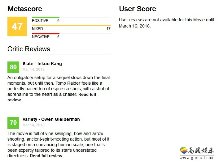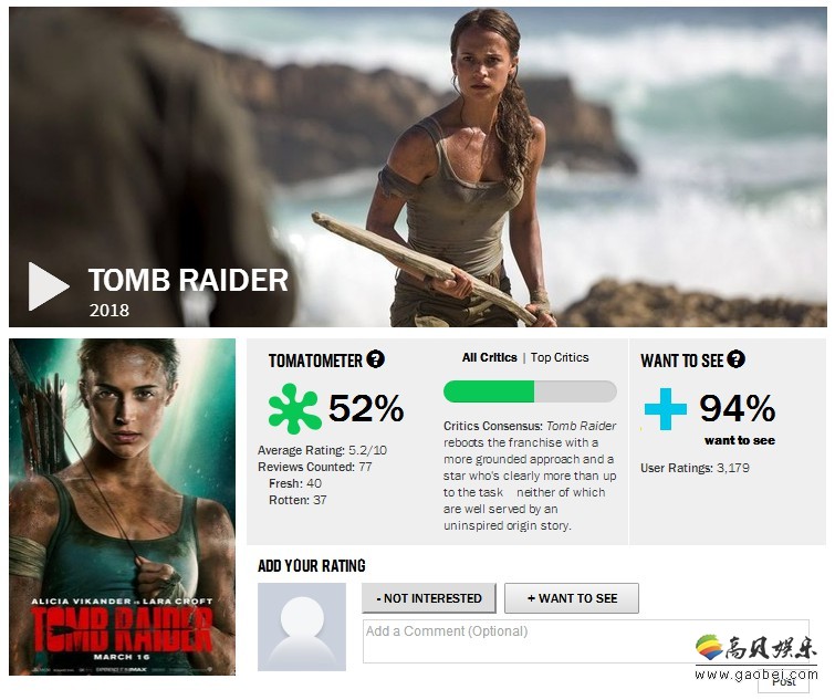 此外,《古墓丽影:源起之战》目前的烂番茄新鲜度为52%,收获了40新鲜,37个烂,相较于前两日50%的烂番茄新鲜度略微上涨。