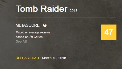 《古墓丽影:源起之战》在Metacritic网站得分47分,在目前收获的29个评价中,有6个好评,6个差评,17个中评,看来多数人还是认为它比较一般。